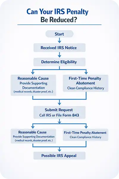✓ Some penalties may be reduced or removed through reasonable cause relief or First-Time Penalty Abatement (FTA) if you qualify.
